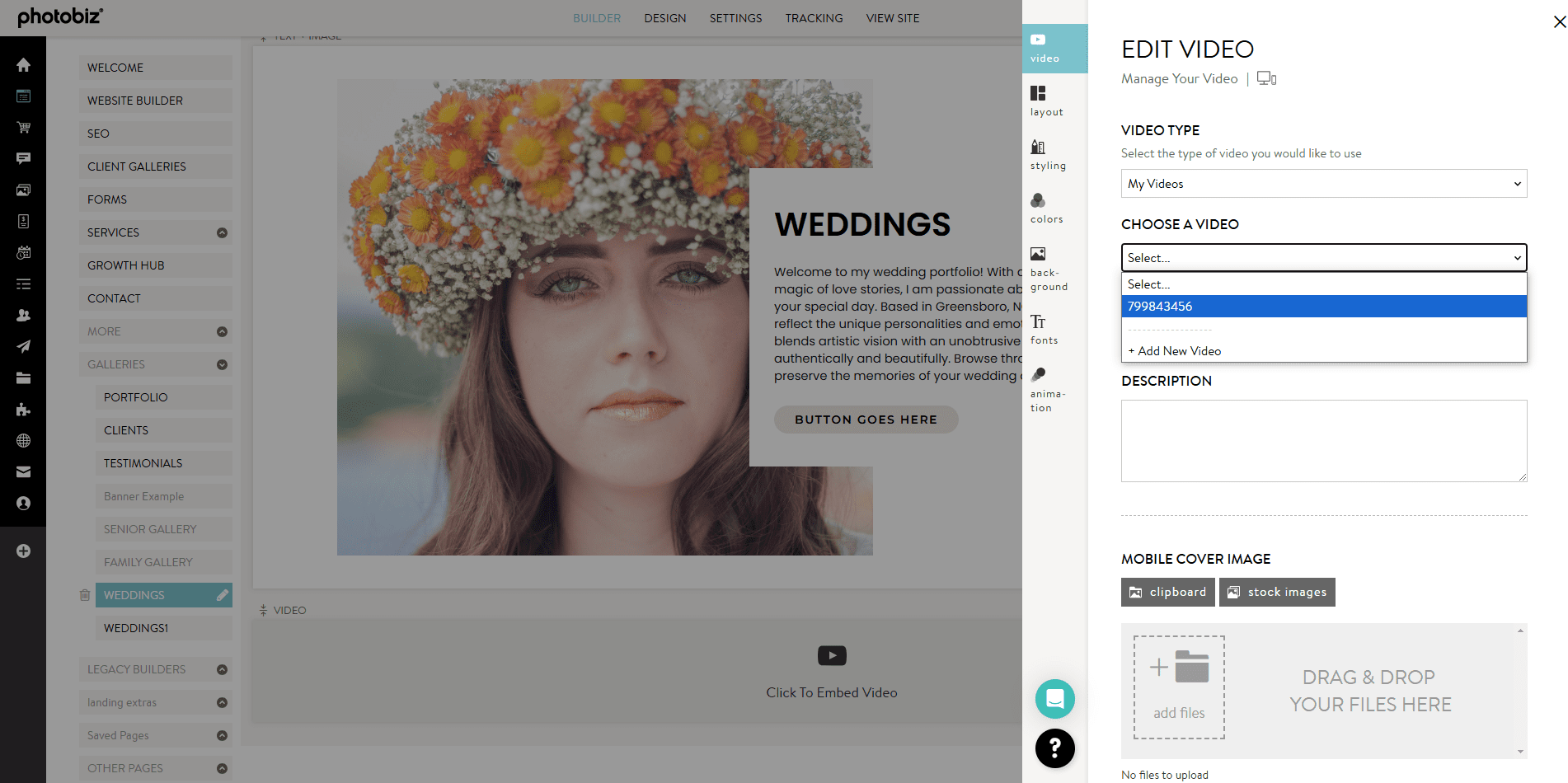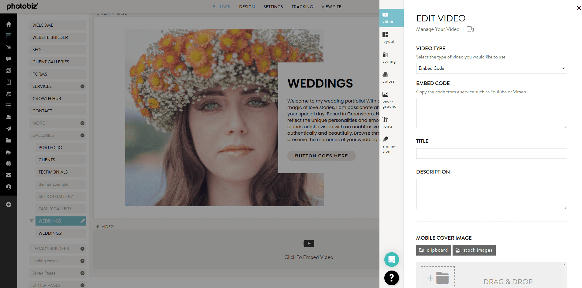 The Video Block in PhotoBiz allows you to showcase video content in a clean, professional, and customizable way. You can embed videos from YouTube or Vimeo, or upload videos directly to your PhotoBiz account.